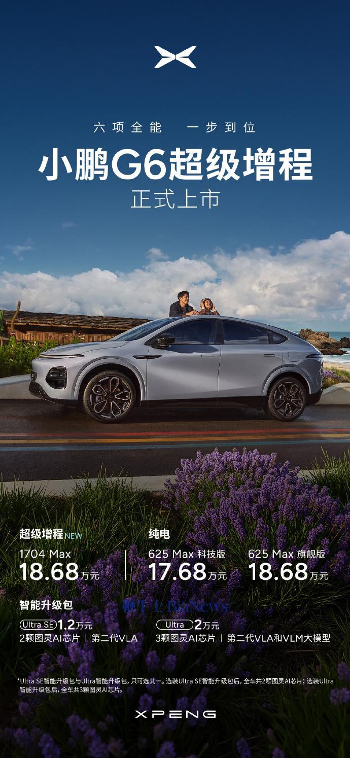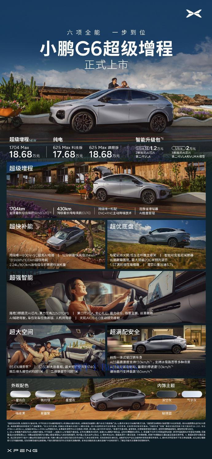 3月6日,小鹏G6超级增程正式上市,售价为18.68万元。