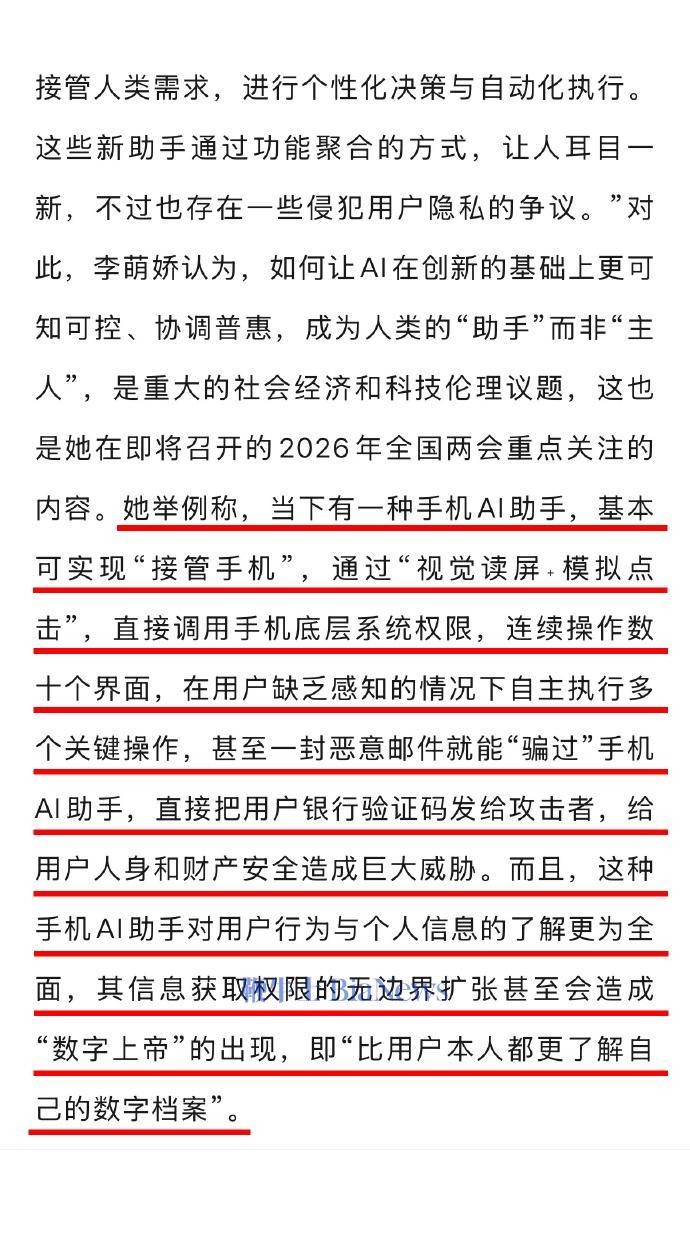 图片显示,一两会委员称:当下有一种手机AI助手,基本可实现“接管手机”,通过“视觉读屏、模拟点击”,直接调用手机底层系统权限,连续操作数十个界面,在用户缺乏感知的情况下自主执行多个关键操作,甚至一封恶意邮件就能“骗过”手机AI助手,直接把用户银行验证码发给攻击者,给用户人身和财产安全造成巨大威胁。而且,这种手机AI助手对用户行为与个人信息的了解更为全面,其信息获取权限的无边界扩张甚至会造成“数字上帝”的出现,即“比用户本人都更了解自己的数字档案”。