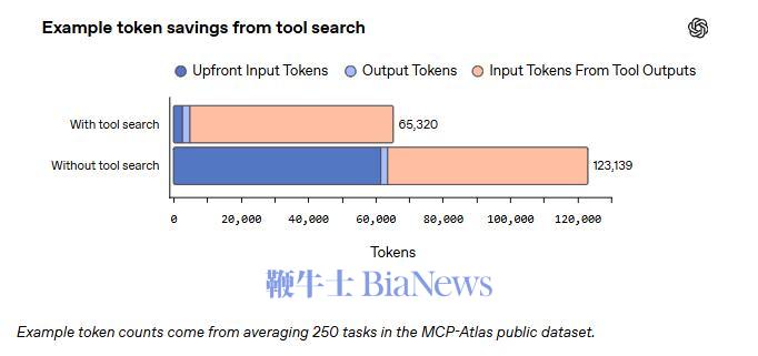 OpenAI以具体数据佐证效果:在使用Scale的MCP Atlas基准测试的250项任务中,启用全部36个MCP服务器的配置下,工具搜索模式相较将全部MCP功能直接暴露于上下文的模式,在保持相同准确率的前提下,总token用量减少47%。
