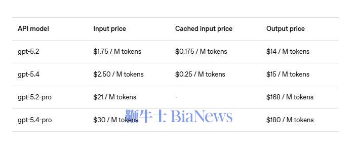 GPT-5.4 Pro:输入30美元/百万token,输出180美元/百万token(GPT5.2 Pro为输入21美元/百万token、输出168美元/百万token)
