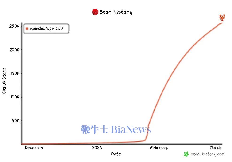 过去这一个月,还穿插着一个春节假期。即便在国内,OpenClaw依然势头不减。截至3月3日,OpenClaw的星数超过25万,已经成为GitHub上星数“第一名”的软件项目。