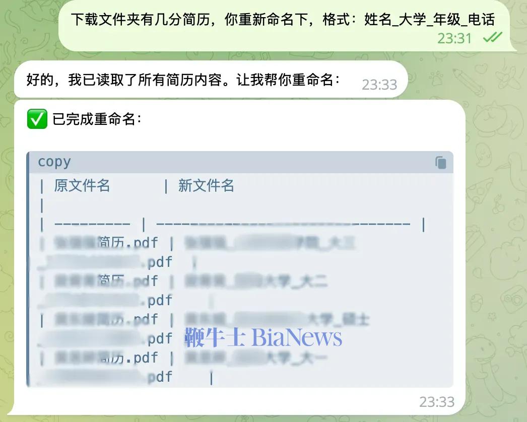 任务一:电脑里的各式文件命名很乱,比如简历,如果手动修改,统一格式为“姓名-学校-年级-电话”,就要点进去看一个个不同的版式,再一一修改;现在,由于OpenClaw有操作本地文件的权限,它就可以代劳了,而我只需要说一句话。