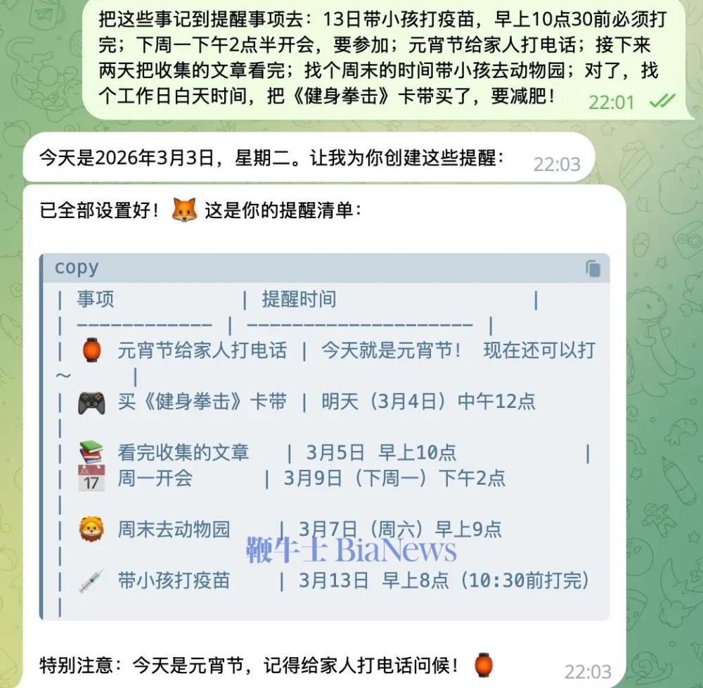 任务三:手机是我最常使用的终端,我可以通过OpenClaw在电脑设置日程,通过苹果全家桶自带的同步便利,随时查看。因为有的时候,日程复杂到“手动添加”也觉得烦的地步。此外,同样的办法,我可以做一个随时可以查看的新闻日历。