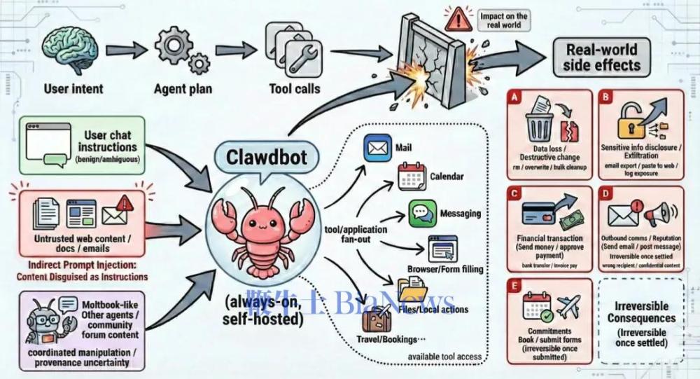 上海科技大学ASPIRE实验室联合上海人工智能实验室的相关论文中,图示了Clawdbot的代理式执行流程与现实世界风险面。用户意图会被转换为代理(agent)的执行计划和工具调用,而这个过程可能会把原本的模糊性或对抗性引导放大,从而产生现实世界中的副作用/来源:arXiv