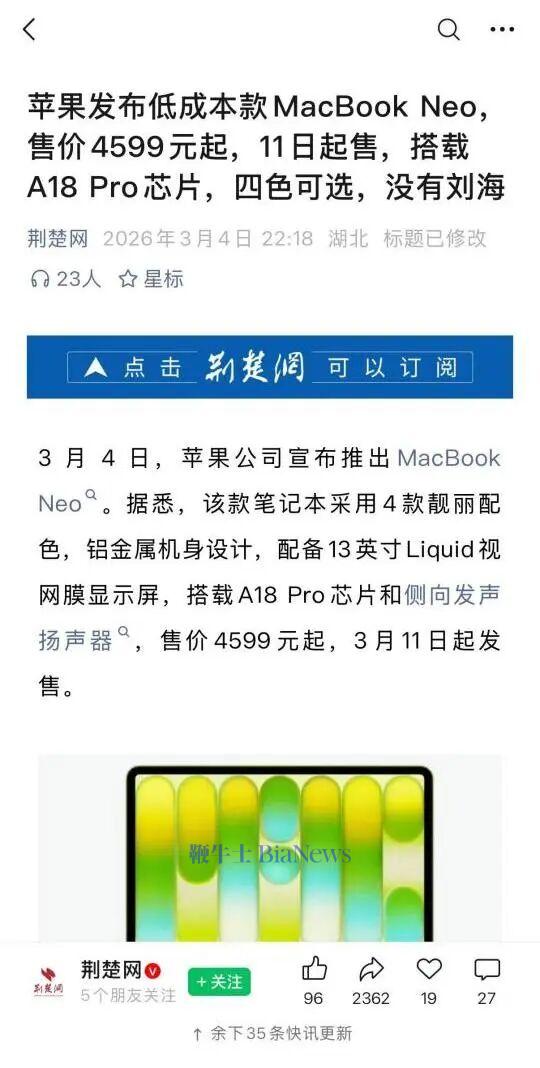 本周果子推出了MacBook Neo,芯片是A18 Pro,售价4599起。