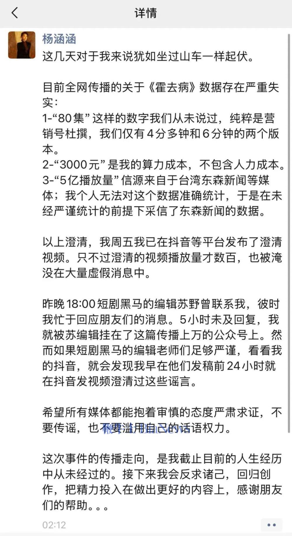 就在今日凌晨2点,《霍去病》导演杨涵涵本人在朋友圈澄清,她提到全网传播的《霍去病》的数据严重失实:关于“80集”,其表示“这样的数字我们从未说过,纯粹是营销号杜撰,我们仅有4分多钟和6分钟的两个版本”;关于“3000元”,她提到这仅是算力成本;而“5亿播放量”,其表示“个人无法对这个数据准确统计”。