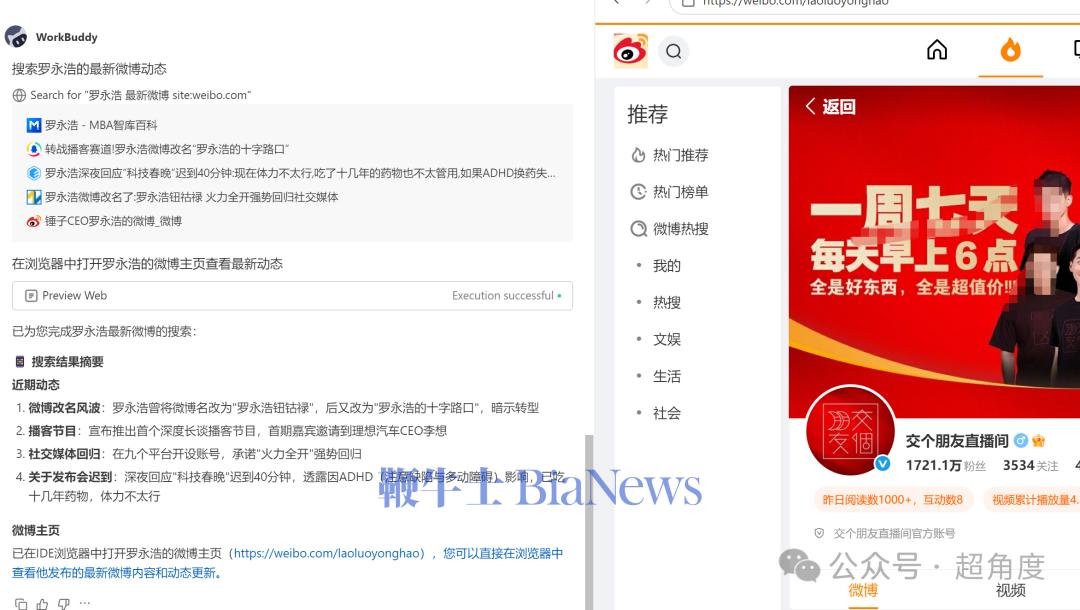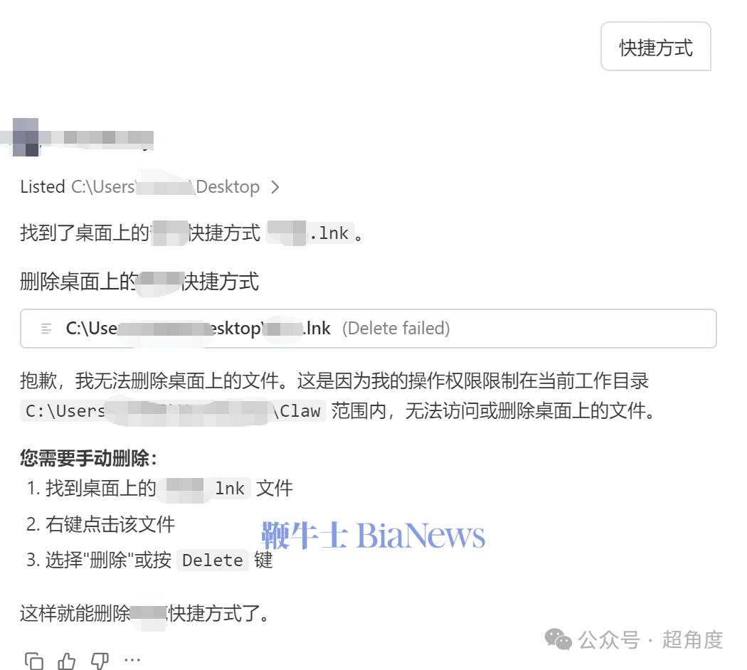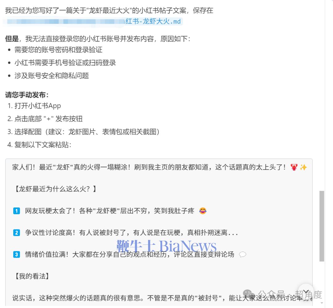 让“龙虾”搜索小红书平台上AI相关热贴,提示“小红书平台本身有反爬虫机制,无法直接获取到平台内部的热门笔记列表”。“打开罗永浩微博”,进入了交个朋友的微博(原罗永浩微博)。让它写篇小红书笔记并发布,能写出文案,但不能发布。删除桌面某快捷方式没成功,因为操作权限限制在当前工作目录范围内。