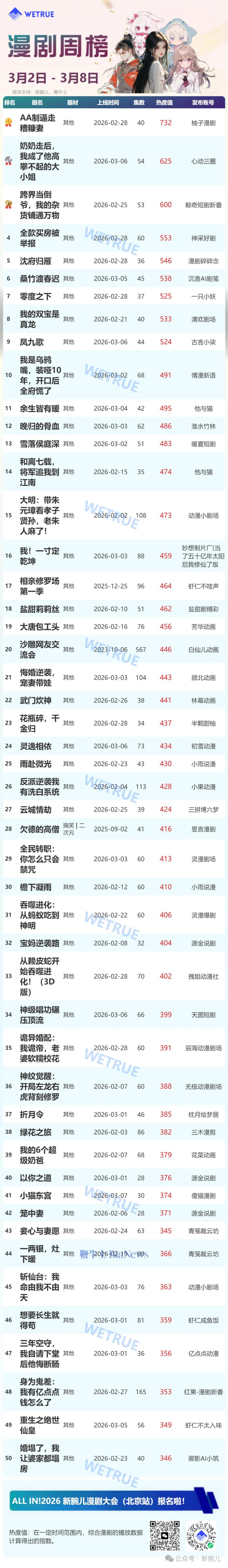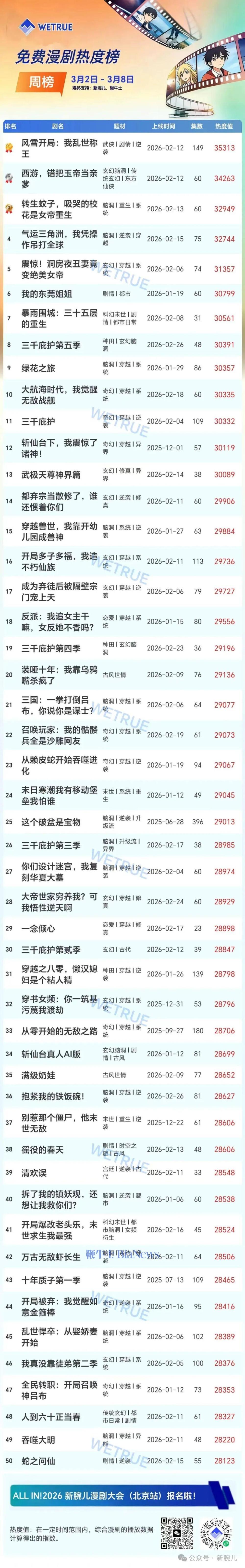 一个发现是,红果top20漫剧热度值趋势与短剧有个鲜明差异,即几乎所有剧集的最高热度值都出现在周一。
