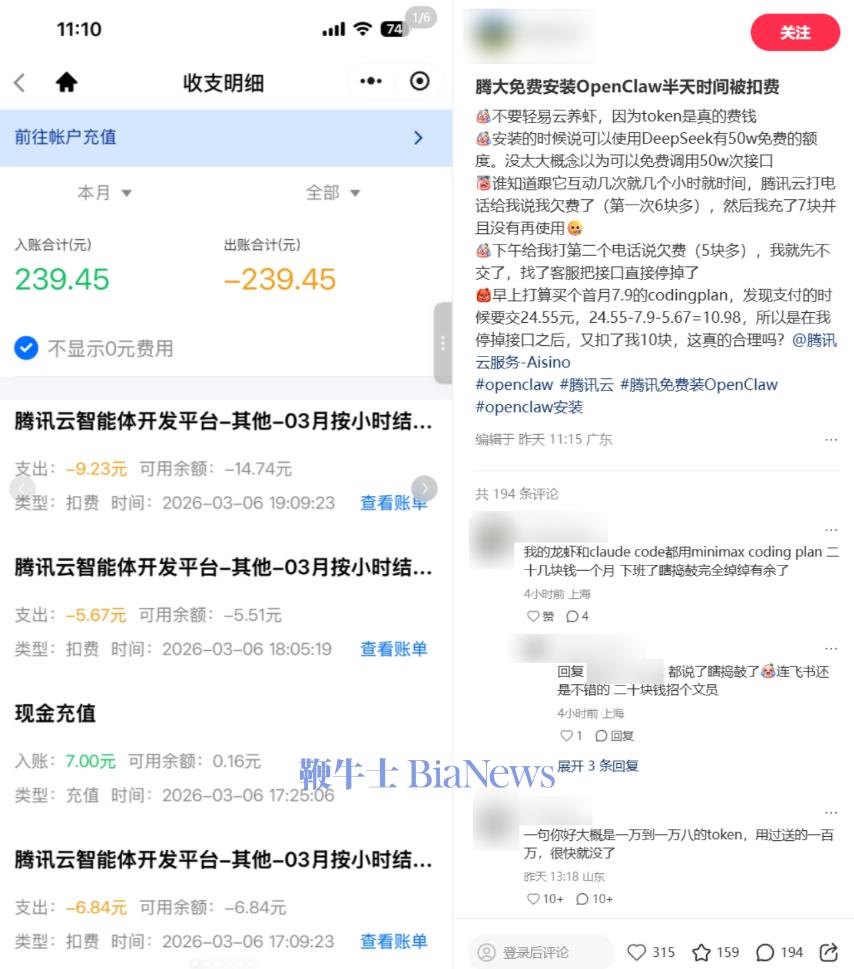 更重要的是,OpenClaw 执行任何一项简单指令都伴随着 Token 的急速消耗——一些不明就里的“小白”用户,周五刚抢着让腾讯免费安装 OpenClaw,周六就发帖吐槽,不仅免费额度已经耗尽,不到一天还倒欠了十几元费用。