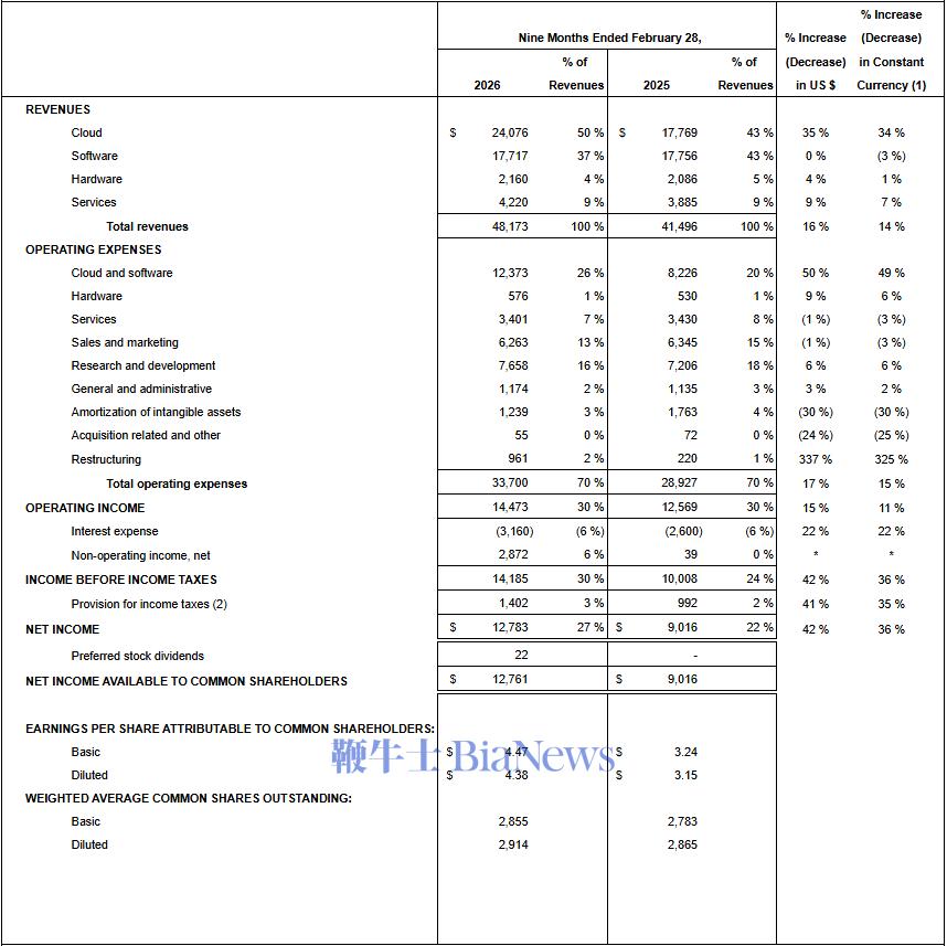 净利润为37.2亿美元,与去年同期的29.4亿美元相比增长26.5%,不计入汇率变动的影响为同比增长21%。不按照美国通用会计准则,甲骨文第三财季净利润为52亿美元,与去年同期的42亿美元相比增长23%,不计入汇率变动的影响为同比增长18%。