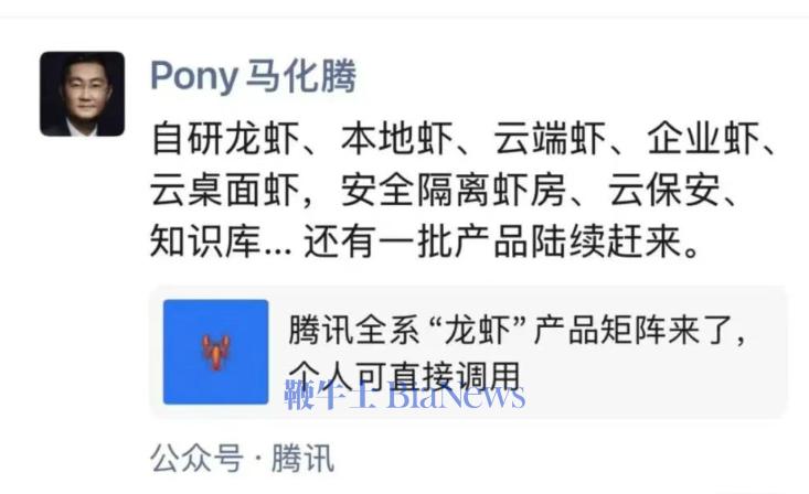 昨天凌晨,马化腾转发了一则《腾讯全系“龙虾”产品矩阵来了,个人可直接调用》微信推文,并表示:“自研龙虾、本地虾、云端虾、企业虾、云桌面虾,安全隔离虾房、云保安、知识库……还有一批产品陆续赶来。”