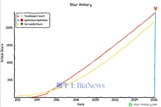 OpenClaw和它标志性的红色龙虾,早在1月就已经火爆了一把,只不过那时它还叫做ClawdBot,在Github上星标的曲线直接拔地而起,72小时就从1万突破到6万,两个月内就突破了25万成为了Github上星标数第一名,要知道原来的前两名可是对开源世界贡献巨大的老前辈React和Linux。
