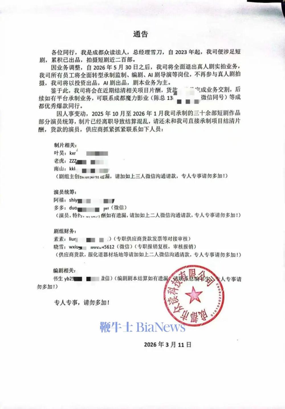 真人短剧正陆续谢幕。3月12日消息,短剧公司成都众读法人兼总经理雪刀发布一则通告,宣布从今年5月30日之后,成都众读将全面推出真人剧实拍业务,所有员工将全面转向承制兼制、编剧、AI剧导演等岗位,不再参与真人剧拍摄,公司后续业务将以投资出品AI剧及剧本为主。基于业务调整,成都众读将会在近期陆续结清相关片酬、货款,完成业务交割。通告中还提到,由于人事变动问题,从去年10月至今年1月期间,他们公司负责承制的三十多部短剧项目的演员统筹、制片,均已离职,导致结算混乱,呼吁供应商跟他们工作人员联系款项事务。成都众读于2023年入局短剧行业,累计拍摄短剧作品近二百部。换算下,年产量近70部,月产量近6部,在业内已是高产选手。该公司的离开,直观映射出真人短剧行业的惨淡。拥抱AI漫剧,已是短剧从业者唯一的选择。(转载自新腕儿)
