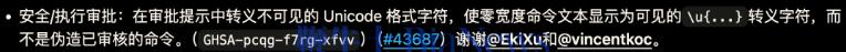 另一个是Unicode零宽字符绕过命令检测的问题。攻击者可以利用不可见字符伪装审批命令,从而绕过执行限制。