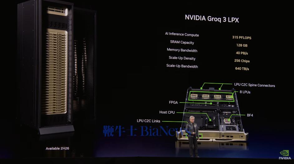 Groq 3 LPX机架搭载256个LPU处理器,提供128GB片上SRAM和640TB/s扩展带宽。LPX与Vera Rubin平台结合后,推理吞吐量/功耗比将能提升35倍。黄仁勋介绍称,LPU芯片将由三星代工,预计机架将于今年下半年开始出货。