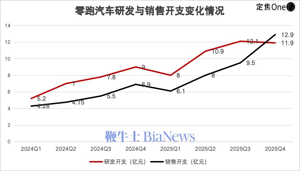 朱江明曾判断,年销量100万台是新造车的生死线,2026年零跑计划跨过这一门槛。 从成立到达成年销100万台车,丰田用了31年,比亚迪用了27年,特斯拉用了19年,而零跑希望用11年完成。 但完成这一目标并不容易,在跨过生死线前,零跑仍然需要面对新的考验。 零跑的2025年: 两个100万与三个关键词 用三个关键词来总结零跑2025年的表现就是:销量登顶、产品线扩张、利润转正。 2025年,零跑是唯一一家实现单月交付超7万台的新势力车企,全年累计销量达到59.7万辆,较上一年提升103.1%,连续两年实现销量翻倍。 在销量的带动下,2025年全年,零跑实现营收647.3亿元,同比增长101.3%,增速与销量基本一致。这也意味着,过去一年零跑的平均售价并没有出现明显提升。 从产品结构来看,相较于其他新势力品牌,零跑是一家没有爆款的车企。 据易车网统计,2025年零跑旗下销量最高的车型是C10,全年销量13.5万辆,在所有新势力车型中仅排名第6。相比之下,同样处于10-15万价格区间的小鹏MONA M03销量达到17.5万台,而20万以上的小米SU7、小米YU7、理想L6、问界M8等车型销量均高于零跑C10。 这也延续了零跑过去几年的产品特点,单款车型爆发力有限,但多款车型叠加后形成规模优势。 2025年零跑在售的车型主要是B、C系列,覆盖10-20万元的价格区间。此外,公司规划的另外两个车型系列,覆盖10万元以下的A系列和20-30万元的D系列也在2025年陆续亮相,并且将在2026年进入市场。 朱江明提出的“未来三年,用A、B、C、D四个系列,十三四款车布满6万-30万元市场”的产品思路,正在逐步落地。 根据乘联会数据,如果用价格带来描述中国汽车市场的规模,10-20万元的价格区间是以销量计的规模最大的细分市场,2025年该市场占比为43.4%;排名第二的是10万元以下的市场,占比28.6%;20-30万元市场规模排名第三,占比16.6%。 如果设想中的四个系列能够顺利推进,零跑的产品将基本覆盖国内乘用车的主流大众价格区间。 在销量和营收提升的同时,零跑的利润率也开始改善。2025年全年,零跑的毛利率达到14.5%,同比提升了6.1个百分点,并且在连续三个季度实现净利润转正后,全年的净利润首次转正,达到5.4亿元。 不过,与同为上市公司的造车新势力小鹏、理想、蔚来相比,零跑的毛利率水平并不高。能够实现盈利,很大程度上是靠对费用的严格控制。 如果把净利润摊到单车层面,零跑2025年平均每卖一辆车大约赚900元。即便年销量接近60万辆,这仍然是一门典型的薄利生意,零跑赚的是“辛苦钱”。 朱江明曾在多个场合解释过,零跑是一家以成本定价的车企,所有人都可以根据每款车的售价简单反推出其制造成本。 但有一点值得注意,在2025年Q4,零跑的销售费用(12.9亿元)首次超过了研发费用(11.9亿元),这说明随着销量的增长,零跑在广告宣传投放力度和销售团队的支出上也水涨船高。 从销量、收入到利润,零跑在2025年确实迈过了几个重要门槛。但另一面是,单车利润偏薄、费用投入上升等问题也开始显现。 这一年同时也是零跑成立10周年。2025年9月,零跑的第100万台整车下线,成为又一家进入“百万产量俱乐部”的中国车企。 在完成第一个“100万”之后,零跑接下来的目标,是在2026年前后向年销100万辆发起冲刺。 销量第一、财报亮眼, 资本市场为什么不买账? 如果只看销量和财报,零跑在2025年交出的几乎是一份“优等生答卷”。但资本市场给出的评价,却没有那么乐观。 年初至今,零跑的股价累计下跌8.35%,尽管其中有一部分原因与港股整体表现低迷有关,但相比于其他几家新势力,零跑的股价依然是表现相对较差的那一个。 同期,蔚来、理想的股价分别累计上涨14.84%、7.79%,小鹏累计下跌1.39%。在市值层面,零跑仅有633.6亿元,只有其他三家的一半左右。 也就是说,销量登顶并没有带来相应的估值溢价。在一些从业者看来,零跑市值偏低主要因为三个方面:技术研发保守;制造业属性更强;销量增长的可持续性存疑。 在其他造车新势力创始人频繁出镜,大谈具身智能、AI、VLA、智驾芯片的时候,朱江明几乎很少在公开场合谈论汽车领域的前沿科技。 对于智驾等新能源汽车行业前沿技术,零跑一直表现得比较克制。朱江明曾坦言,零跑在智驾上一直采用的是跟随策略,等一项技术被市场验证,再选择跟进。 因此,零跑不会投入大量资源去押注技术路线,这一策略也反映在财报里。过去一年,零跑研发投入42.9亿元,研发占比为6.6%。与之相比,蔚来过去一年的研发投入达到106.1亿元,占比12.1%;理想研发投入113亿元,占比10.1%。 小鹏的2025年Q4财报尚未发布,但前三个季度的单季研发投入都在20亿元水平。在3月16日晚的一场直播中,何小鹏称过去十几个月仅在VLA智驾系统一项上,每个月就要烧掉3亿元。 相比而言,零跑在研发投入上显得过于保守。 再来看行业属性。 尽管朱江明总是将零跑极致的性价比归功于技术创新,但这里的创新更多体现在制造体系和供应链效率上。这并不简单,但在资本市场上也算不上一个好故事。 图源 / 零跑汽车官方微博 通过提升零部件通用率、扩大平台化程度,零跑能够在多款车型之间共享大量组件,从而降低生产成本、简化生产流程。 为此,零跑自建17座零件工厂,约65%的零部件实现自研自制。 这套体系确实帮助零跑在成本控制上建立了优势,但在资本市场看来,这更像是制造能力的优化,而不是一家高科技公司的成长叙