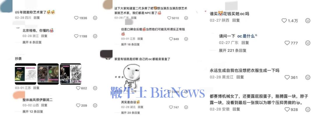 一部分声音指向IP本身,认为其人物比例、神态和整体呈现带有明显的“男性凝视”;另一部分质疑则落在表达层面,认为“生成自我”的概念与最终视觉呈现并不匹配;还有一部分负面情绪,进一步延伸到了设计师本人及其履历之上。