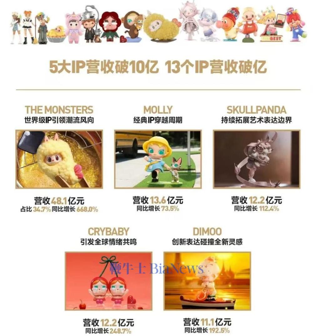 2025年上半年,泡泡玛特共有13个IP收入过亿,其中THE MONSTERS以48.1亿元收入成为新晋顶流,“星星人”加入仅一年便实现3.9亿元营收。泡泡玛特进入了一种“头部稳增长、腰部接热度”的接力赛,践行了王宁的那句“孵化新IP的速度,我们比迪士尼快。”