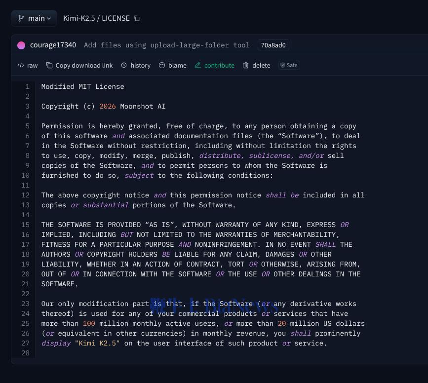 如果你用这个模型做商业产品,并且规模够大,必须标明Kimi K2.5.