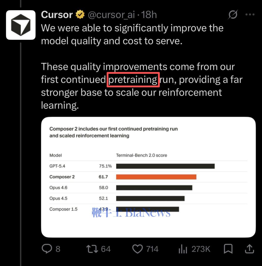 几乎可以实锤,Cursor「暴打」Claude的最强自研模型,就是在Kimi基础上做了一道后训练。