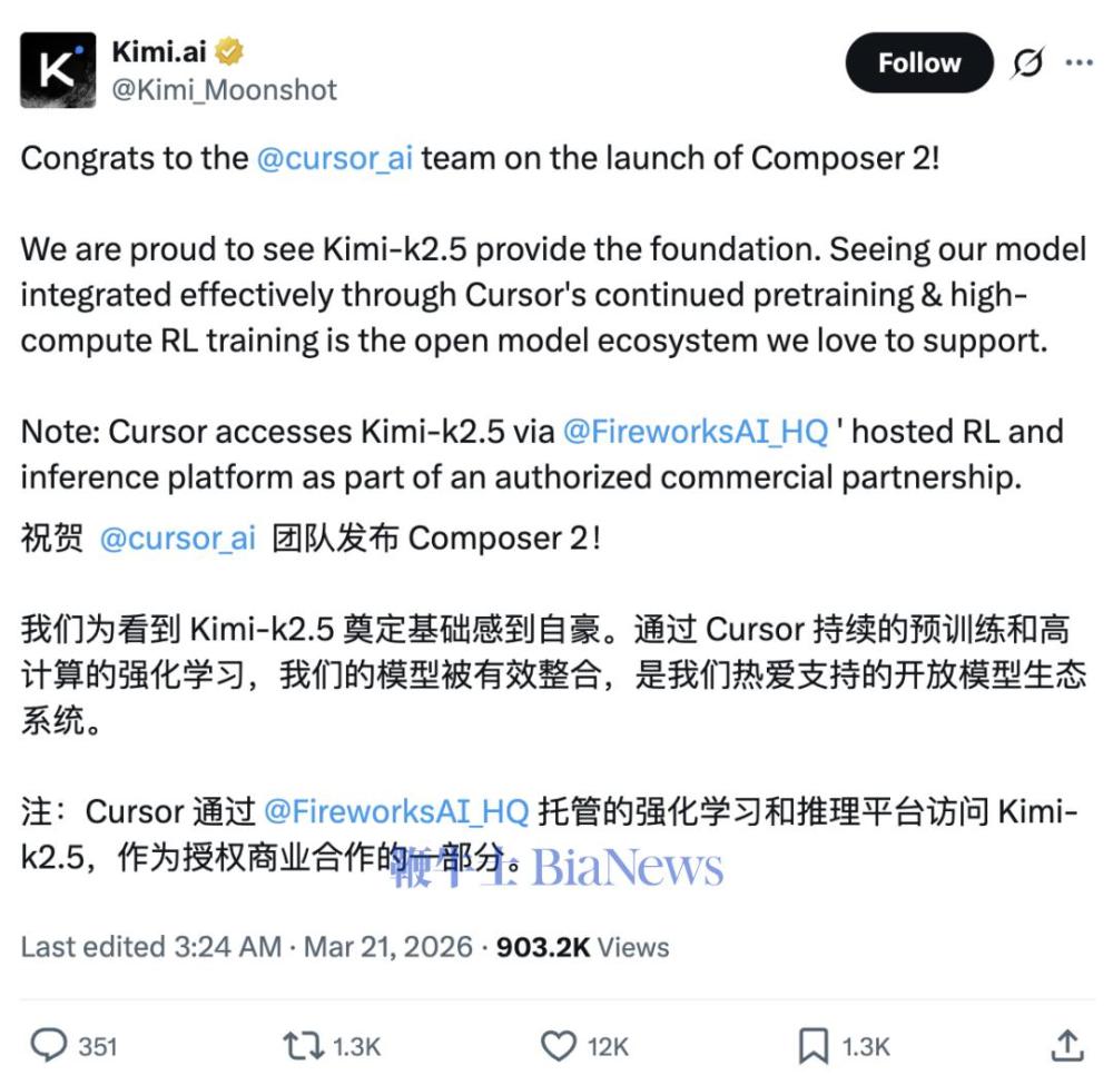 补充说明:Cursor是通过FireworksAI提供的托管强化学习与推理平台来访问Kimi-k2.5的,这是一个经过授权的商业合作关系。