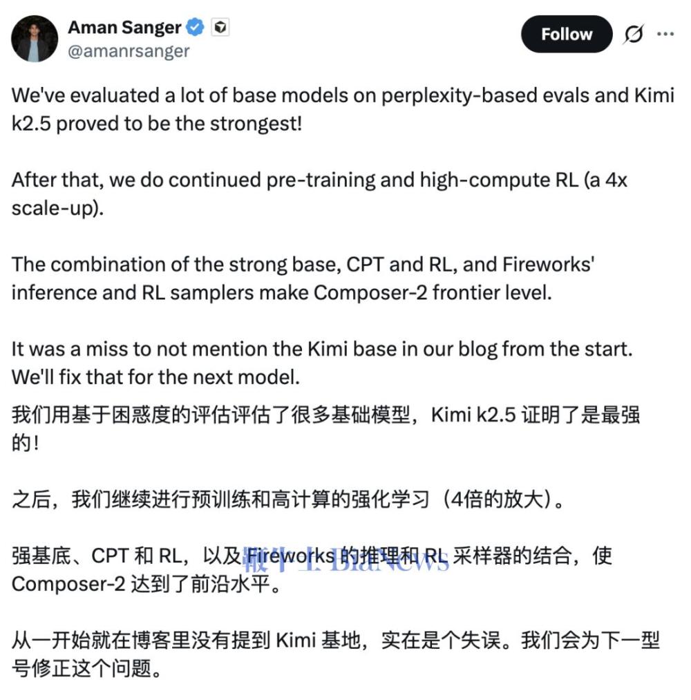 随后Cursor创始人Aman Sanger好像也终于想起了开源协议这件事,上来就对Kimi一顿猛夸:
