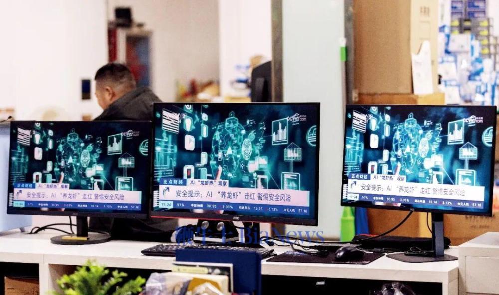 3月11日,浙江湖州市吴兴区颐高数码广场,电脑显示器在播放开源AI智能体“龙虾”的相关新闻。图/新华