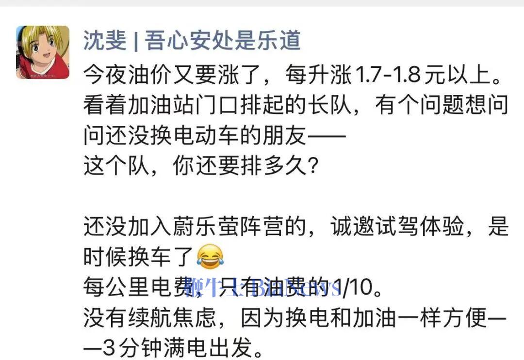 值得注意的是,目前的国际油价仍显著高于周期内均价,如果国际油价不出现明显下跌,国内油价预计涨幅将继续扩大。 按金联创估价模型测算,假设国际油价维持3月16日水平不变,本轮零售油价的调价幅度将在2000元/吨左右。折合92汽油、95汽油、0柴油每升分别上涨1.60元、1.69元、1.7元。 一辆油箱容量为50L的小型家用车,加满一箱油将大约多花80元,如果油箱容量为70L,则要多花112元。 燃油车的焦虑 3月23日24时,也就是周一凌晨0点,全国统一调价。 不管是中石油、中石化,还是民营加油站,都会同步执行新价格,不提前、不延后,没有例外。简单说,只要过了晚上12点,油价就会直接上调,想省钱的车主别错过最后窗口期。 事实上,这已经是油价在今年年内的第6次上涨了。 3月9日24时油价进行了2026年第5次上调,大涨超过0.52-0.61元/升,北京、上海92号汽油已经达到或者超过7.6元/升。 这一次涨完,92号汽油突破“9元”大关是板上钉钉了。 嘴上说着没必要,但在这个周末,全国各地的加油站都挤满了提前加油的燃油车,有的还需要排队数个小时,堪比春运高速充电现场。 有网友表示,“不过是为了碎银二两而已。” 上一次油价涨成这样还是在俄乌冲突期间,2022年6月15日,92号汽油的价格达到9.33元,95号汽油的价格更是到了9.93元。 当年2月份俄乌冲突爆发,俄罗斯是全球前三大产油国,冲突直接冲击全球能源供应预期。6月初,欧盟第六轮制裁落地,宣布6个月内禁运俄海运原油、8个月内禁运石油产品,预计减少俄石油出口约300万桶/日,市场恐慌供应缺口扩大,布伦特原油在6月初一度冲高至124—125美元/区间。 在中东冲突之后,战争走向已经彻底脱离“速战速决”的预期,演变成了一场看不见尽头的拉锯战。 布伦特原油的价格再次突破了100美元。战场虽在中东,但油价飙升是战争直接导致的“隐形税负”,分摊到了全球。 如果说,国内只是涨涨价而已,越南差点到了停摆的地步。 在一些博主上传的短视频里,越南的缺油危机已经急迫到加油站里排队加油的摩托车排出数十米长,公交车甚至因为缺油,需要众人一起推车……甚至航空燃油也告急停飞。 河内许多加油站已经被迫挂出限购告示:摩托车每次限加3-5万越南盾,汽车根据车型每次限加30万-50万越南盾——加完油量甚至不足油箱的一半(加满需要130万越南盾左右)。 不得不说,我国提前发展清洁能源和新能源汽车眼光太过超前了。 利好新能源? 面对眼下油价不停上涨的势头,有不少人问道:中东乱局要是继续,油价会不会继续涨?年内有没有可能突破10元?最后,脱口而出的问题就是,你还开油车吗? 上世纪70年代的两次石油危机,直接导致当时如日中天的美系大排量汽车销量崩盘,擅长节油技术的日系车大放异彩。如今相似的情节再度上演,以电动汽车为代表的新能源汽车主导行业的机会可能真的来了。 乐道汽车总裁沈斐在油价飙升之时也“幸灾乐祸”地发了个朋友圈,“看着加油站门口排起的长队,有个问题想问:问还没换电动车的朋友一这个队,你还要排多久?” 简单做一个计算题,一辆紧凑型燃油车年均油费约7000-9000元;纯电动车家充年均电费约1000-1500元,公充约2000-2500元;插混车型可油可电,市区通勤用电、长途用油,年均能源成本约3000-4000元。 按5年使用周期计算,纯电动车较燃油车节省成本约3-4万元,插混车型节省约2-3万元,足以覆盖同级别车型的购车差价。可以说,油价每上涨一次,这个回本周期就缩短一段,消费者的转化意愿就增强一分。 出租车司机日均行驶350公里,百公里油耗8升,月用油成本将增加1000元左右。货运司机压力更大,长途货车每月行驶1.5万公里,百公里油耗35升,调整后月用油成本更是增加超过10000元。 杭州的网约车司机刘师傅是为数不多还在开燃油车跑车的人了,这一轮的油价上涨恐怕也成为压倒骆驼的最后一根稻草。“偶尔涨价加一次油无所谓的,但今年一直在涨,吃不消了。” “照这个势头下去,油价很可能要突破十块,我一天就要多一百块,一个月多300块。”刘师傅表示,这辆跟了十几年的老丰田在如此高油价面前也显得不太省油了。 特别是在群里那些新能源车友的对比下,这个反差更加明显,刘师傅决定在今年五一前趁着杭州地方刚刚给的汽车消费补贴换一辆新能源。 有分析认为,2025年国内新能源汽车渗透率已达48.5%,2026年机构普遍预测全年渗透率突破57%-60%,销量有望突破1900万辆。燃油车销量从过去的七八成,降至四成左右,有望从市场主流变成边缘选择。 汽油价格上涨,本质是能源结构转型的市场信号。它不是新能源汽车发展的根本动力,却是加速普及的关键催化剂。 当燃油车的使用成本持续走高,当新能源汽车的产品力、便利性、经济性全面领先,消费者的选择早已不言而喻。 近期多个新能源汽车品牌针对油价上涨推出了针对性营销活动,包括“油费补贴”、“充电礼包”等优惠措施,有的品牌甚至开发了专门的“油电成本对比”小程序,让消费者直观感受不同动力类型车辆的用车成本差异。 在全球局势动荡,油价高居不下之时,没想到新能源汽车反而成了最大赢家。(转载自BusinessCars)