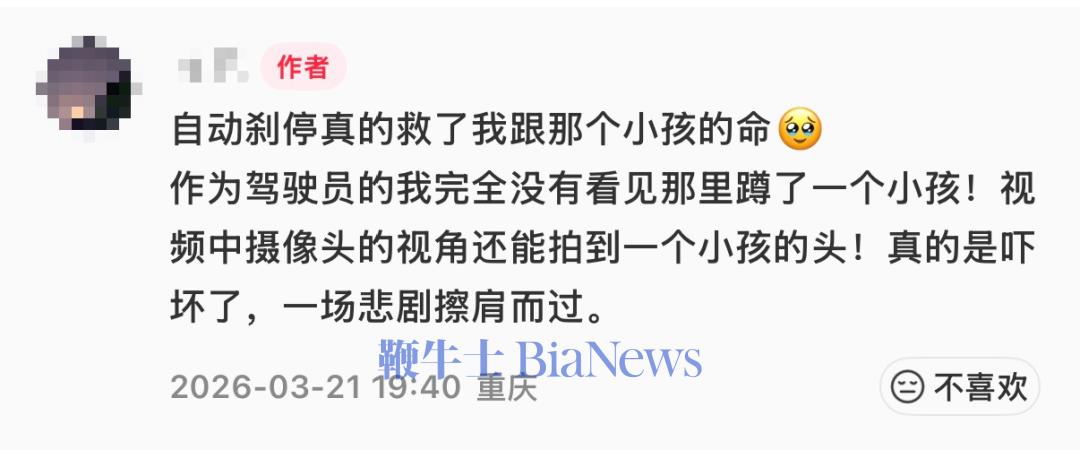 车主表示,“自动刹停真的救了我跟那个小孩的命。作为驾驶员的我完全没有看见那里蹲了一个小孩!视频中摄像头的视角还能拍到一个小孩的头,真的是吓坏了,一场悲剧擦肩而过。”