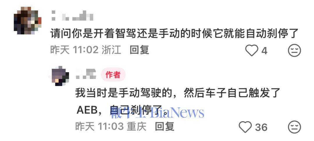 评论区有人询问车主,触发自动刹停时,车辆是否为智驾模式?