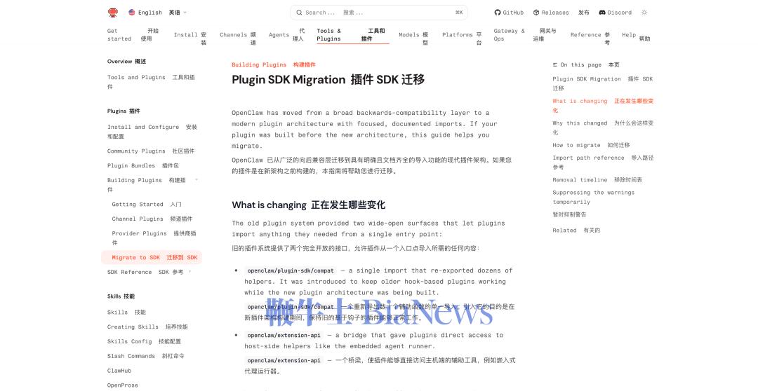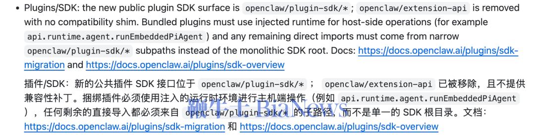 以前的统一入口的模式,会导致插件一口气把整个开发包(SDK)全加载进内存,哪怕它只用到了一小部分功能,这会让软件变得臃肿缓慢。现在官方强制要求细分路径(比如必须写精确到 openclaw/plugin-sdk/core),就是要逼着插件作者「要什么拿什么」,从而大幅提升 Openclaw 的启动速度。此外,更新日志里还提到了「阻断相对路径的跨包逃逸」。意思是以前的旧接口太宽松,稍微有点恶意的插件可能会越权访问你电脑里的其他数据。现在强制使用细分的新接口,是为了把每个插件严严实实地关在自己的小盒子里。OpenClaw 在自己的官方文档里也立刻更新了说明,提到这个更新,主要就是为了实现按需加载,提升启动速度和省内存,另一方面是让 API 的接口更加清晰。OpenClaw 的插件更新,提到了为什么要改变,做了哪些改变,以及插件开发者如何修改的指引强制遵守 API 规矩,就是要求插件只能使用公开的、稳定的接口(也就是 openclaw/plugin-sdk/* 里面的东西)来获取能力。如果大家都用相对路径去偷偷访问底层的私有代码,一旦官方修改了底层代码的文件夹名字,就会直接拦截报错。原因已经很明显了,就是微信的 clawbot 插件找不到和 OpenClaw 对接的路线了。微信和企微插件的作者在写代码时,使用的是旧版的规则,代码里写死了要去 openclaw/plugin-sdk 找工具。而在我们启动新版 Openclaw 时,程序读到微信插件的这行代码,去系统里一找——发现官方已经把这个路径给删了。OpenClaw 的运行环境使用的是 Node.js 平台,它是个一板一眼的机器,找不到东西它就会立刻报错:Error: Cannot find module 「openclaw/plugin-sdk」,然后直接原地罢工,导致我们的微信和企微甚至连加载都加载不出来。更不用说发消息给他,想要得到回复了。而 QQBot 还能正常使用,主要是一开始的危险代码警告,仅针对这次更新引入的严格静态代码扫描工具,警告并不会阻止插件运行。社交媒体上对这件事议论纷纷,有人说「微信想要继续好好利用这个插件,就必须认真学习开源生态系统的相关知识了。」也有人反驳,是 OpenClaw 本身就很不稳定,一直在更新修改。「即便微信要对开源做适配,为什么不直接说 OpenClaw 的 API 设计太糟糕呢?项目一开始的接口简直就是一堆乱七八糟的东西,稍微改动一下就崩溃」。确实如此,通常开源社区负责任的做法是,会先标记旧接口为「已废弃(Deprecated)」,保留运行能力但弹窗警告,给开发者几个月的过渡期,下个大版本再彻底删除。这次,微信辛辛苦苦更新了一个版本,推出了支持二维码登录、消息收发等功能的「真.微信龙虾」,甚至有网友发现在微信公开的这个插件安装包里面,是微信第一次开放个人机器人的协议。链接:https://www.npmjs.com/package/@tencent-weixin/openclaw-weixin但刚迈出了这么大的一步,反手就被 OpenClaw 的一次更新给「背刺」了。(转载自APPSO)