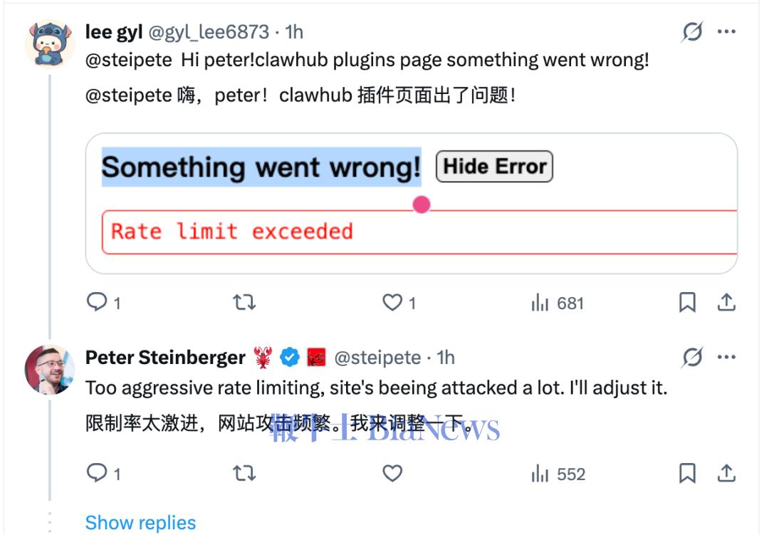 针对ClawHub 访问异常问题,OpenClaw开发者皮特·斯坦伯格(Peter Steinberger)回应称:为了抵御频繁的网络攻击,限流规则设置得过于严格。后续会调整限流策略,放宽限制以恢复正常访问。
