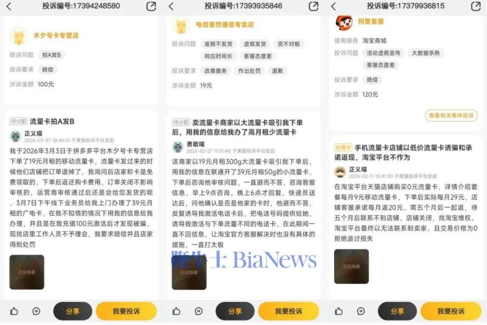 货不对板?“低价引流”套路多 伴随短视频、直播等应用爆发式增长,消费者对流量的需求持续攀升。在多家电商平台上,号称“一分钱领卡、超低月租、收货地即归属地”的大额流量卡正在畅销。《BUG》栏目发现,该类流量卡虽看似便利,但背后却套路满满,已有不少消费者上当。 一方面,该类店铺用小金额“诱导宣传”。 在包括抖音、淘宝等电商平台搜索“流量卡”,便出现大量售卖该产品的商家。 其产品宣传页面上,“200G”“19元/月”等字眼十分显眼,消费者只需要0.01元便可购买。同时,商家们还打上了中国电信、中国联通、中国移动等多家运营商的Logo,以进一步增强信任感。 《BUG》栏目随机咨询了多个商家后得知,所谓“0.01元”“19元”并非实际费用,而是在综合各种优惠、折扣或返现等因素后的金额。例如消费者花费0.01元下单后仅获得该流量卡,真正想用起来则需要充值更多金额。 也因价格过于优惠,导致不少消费者纷纷下单,最终却发现“货不对板”。 消费者维权平台黑猫投诉上,王明(化名)表示,商家以“19元300G大流量卡”吸引下单后,却用其个人信息开通了月租39元50G的小流量卡,“快递员送达后反复诱导激活与下单不同的流量卡”。 有消费者表示,购买的19元月租移动流量卡,到货后商家以免费领取为由将订单取消,“结果业务员上门办理的却是39元月租的广电卡,充值后才发现被骗。” 另一位消费者则更特别,在淘宝天猫店铺购买的移动流量卡,每月套餐费用为9元,实际却高达29元,“客服还称每月返现20元,需5个月后一起返,最终店铺关闭无法联系商家。” 多家运营商否定“大额套餐” 另一方面,部分套餐内的流量也是多个活动叠加而成。 比如某销量超5.6万的店铺,其首页显示为“200G通用流量”。而咨询后,商家才称首月和次月仅为90G,注册满70天后才升级为200G。 抖音一家评分4.7的店铺也是在追问后才表示,所谓的90G通用套餐被拆分为三部分,原有套餐仅20G通用流量,另外还需通过充值和多用多送活动领取才可凑成完整套餐。 值得注意的是,在与《BUG》栏目交流过程中,多位商家均确认其为官方授权套餐,购买后可以在相关App中查询。而当提及注销事宜时,其又表示仅能提供协助,真正注销要到当地营业厅才行。 “管卖却不管注销”,“巨额流量卡”是不是真实的? 中国移动官方客服表示,并没有见到过类似的流量套餐,购买后跟实际可能有出入,“暂时还没有看到用户办理成功。100G的套餐肯定不止19元,要有心理准备。” 中国联通官方客服表示:“没有推出过专门用流量的流量卡,更没听说过19元200G的套餐,目前能接近百G流量的套餐最低也要110元/月。” 中国电信官方客服表示:“需要注意是否为某个省市的特殊情况,尽量选择从正规渠道购买。” 此外,海南省通信管理局也曾公开过类似案例。有消费者表示在抖音店铺购买的“中国移动19元235G流量卡”,实际收到为月租 59 元的潮玩青春卡,仅 10G 通用、30G 定向流量,其认为运营商涉嫌虚假宣传。 海南省通信管理局在回复中直言,此举并不属于增值电信业务许可范畴,系商家以“巨额流量卡”为噱头吸引消费者购买的行为。 电商平台失位? 律师:不知主体均可索赔 虽然店铺自称官方授权,但各大网络运营商却均否认有对应套餐。 对此,淘宝官方客服称:“不会让商家来砸我们的招牌。商家若存在违规行为,平台对应的商家部门会按照规则进行严厉处理。”但其对于“店铺涉小字宣传”和“不实套餐”问题均未给出明确答复。 《BUG》栏目查询发现,这些商家的货源或源于不同平台。搜索“流量卡代理商”可以发现,网页将跳转出包括宝时信、流量都、物商网等多个分销平台,通过简单的信息填写便能成为流量代理商。网站给出的待遇也颇为优厚,声称每单佣金可达80-230元。 在平台内,有中国电信、中国联通、中国移动等多家运营商的多种套餐,每个套餐内还附有推广链接、产品海报和结算规则等信息,不同的套餐有不同的结款模式,如“次月返”“秒返”等。只要消费者通过对应方式下单激活,代理商便可收到佣金。 那么,“套路满满”的流量卡和“小字诱导”,消费者下单激活却发现货不对板,谁又能来负责? 上海申宜禾律师事务所王龙国律师向《BUG》栏目表示,原则上谁是售卖主体,谁承担责任。从维权的角度,如果消费者在不知道责任主体的情况下,可能选择向所有涉及的主体主张责任。 他举例称:“如果中国电信没有自己售卖或者授权第三方售卖,中国电信就不用承担责任;如果确定是平台上的商家售卖,则商家需承担责任。”(转载自新浪科技)