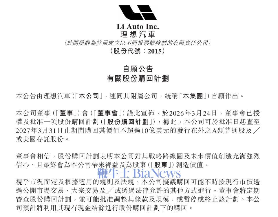 理想汽车创始人、董事长兼CEO李想在公告中表示,回购计划体现了管理层对公司战略规划与未来价值创造的坚定信心。