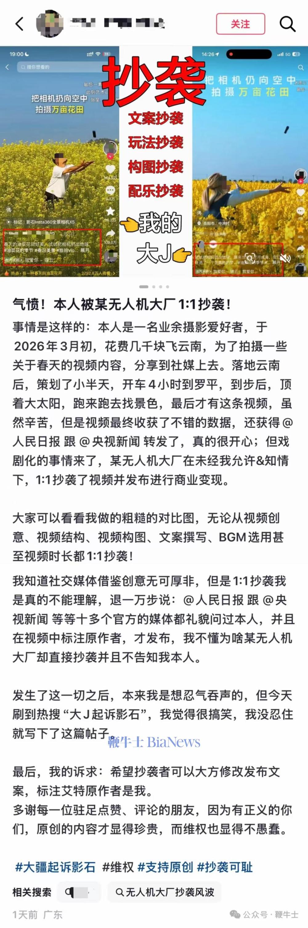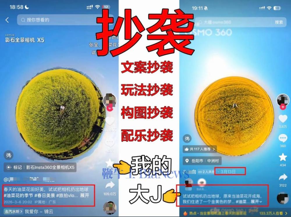 据悉,博主原创视频发布日期为3月6日,大疆参与创作的视频发布日期为3月13日。