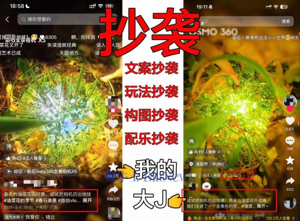 从对此图来看,两个视频的画面构图、机位视角、画面色彩,确实极为相似甚至有重合。而视频文案皆为“把相机扔向空中拍摄万亩花田”。