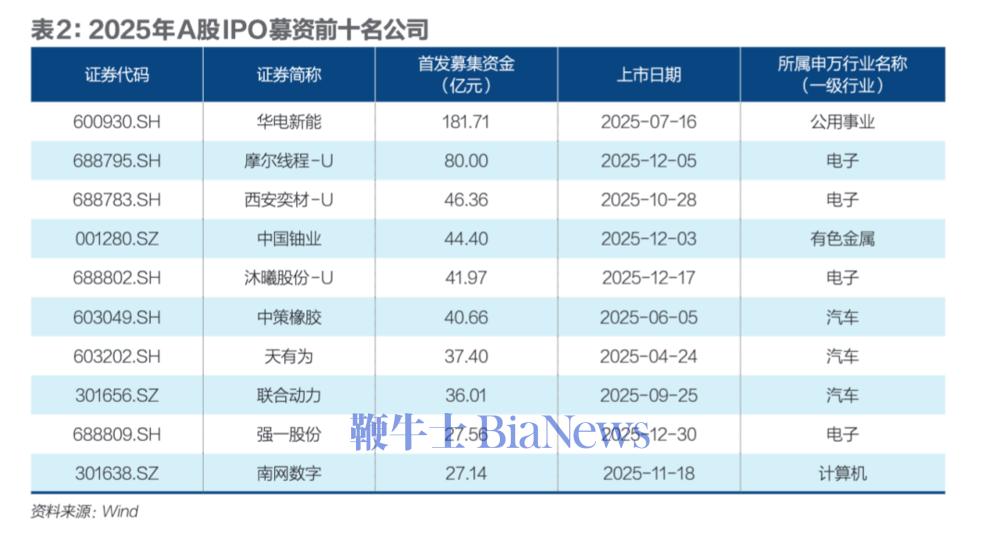 A股市场上,分行业来看,电子行业以365亿元的募资金额,高居首位。该行业的细分行业中,半导体以275亿元的IPO募资额成为主力军。2025年,共计有10家半导体公司登陆A股,摩尔线程(688795.SH)、西安奕材(688783.SH)、沐曦股份(688802.SH)募资金额均超40亿元,分居行业前三。