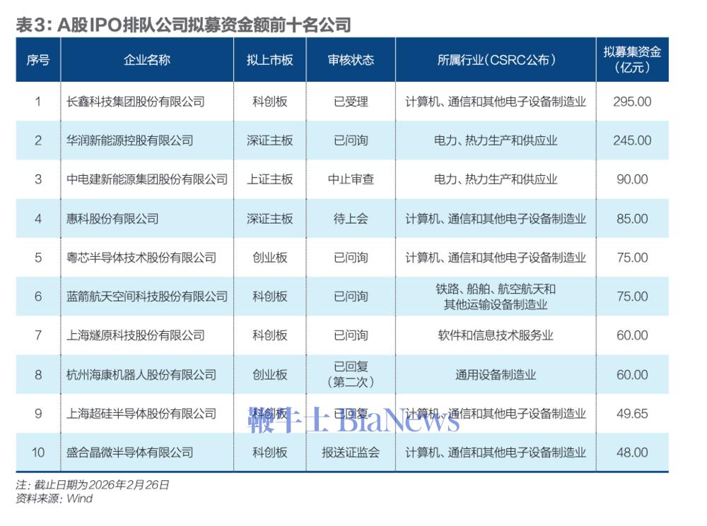 从排队上市的企业来看,截至2026年2月26日,341家A股IPO排队公司合计拟募资金额3447亿元。其中,拟登陆科创板、创业板、北交所的公司数量合计占比超八成;募资金额合计占比超七成。