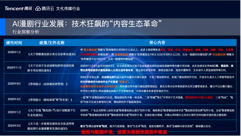 行业政策方面。从2024年开始,国家就一直在强调规范引导漫剧行业有序发展,直到2026年1月份,国家颁布了针对短漫剧的强制性评分投资成本的审核要求,这将成为我们整个漫剧行业牢固的产业支柱之一。