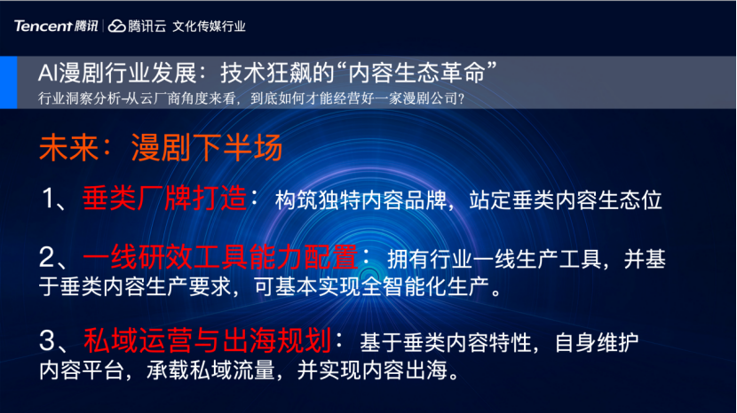 第三,做好私域运营与出海规划。基于垂类内容特性,维护好内容平台,承载好私域流量,最终能以高品质内容实现内容出海,这也是历史上我们互联网行业和泛内容行业一直在做的事。