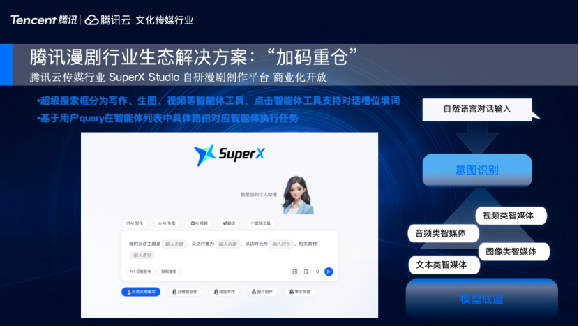 腾讯云传媒行业也有一套自研的Super-X Studio漫剧创作平台,支持无限画布拖拽,一站式完成漫剧内容制作生成,在广告片制作或短视频制作优势明显。