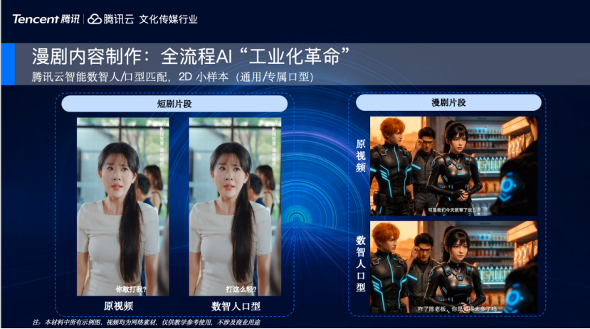 下一款是腾讯云口型匹配,从腾讯云强大的数字人能力上切分而来,把数字人产品中表现良好的口型生产能力改造封装成了适用于漫剧场景的原子能力。