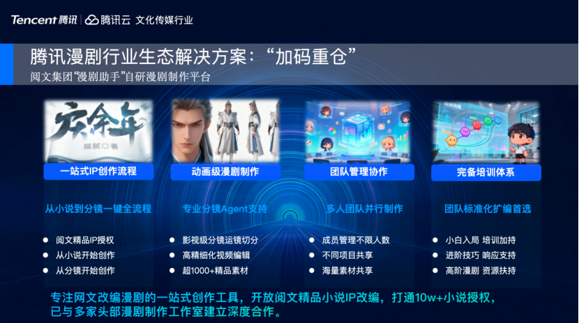 刚才提到全链路、一站式漫剧制作平台,就是我们和阅文集团联合推出的漫剧助手,从小说分镜到专业Agent支持,到团队并行制作。这款产品也是行业头部酱油文化一直参与内测、持续打磨,配合阅文集团推出的平台工具。
