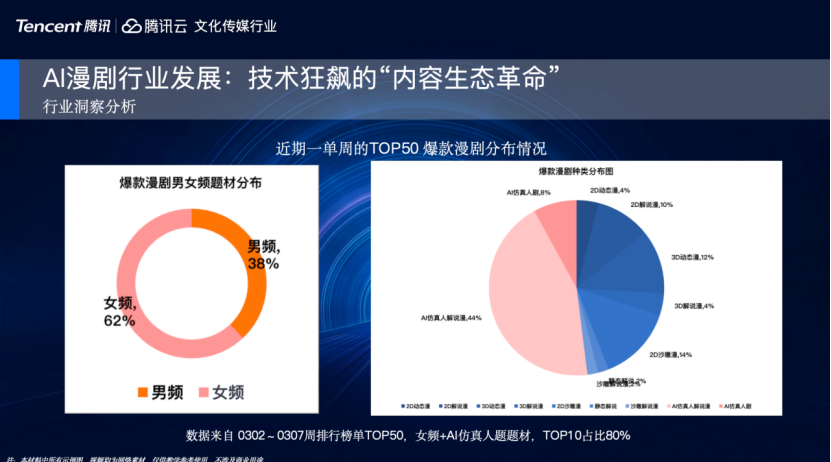 先看一组数据,我们就前两周的榜单做了整理,发现女频已经占据大部分市场,占比约60%,显然漫剧已经从2025年男频主导的市场环境,转变到女频,女频正是通过与近期爆火的AI仿真人解说漫与短剧深度绑定,实现了市场份额突破。