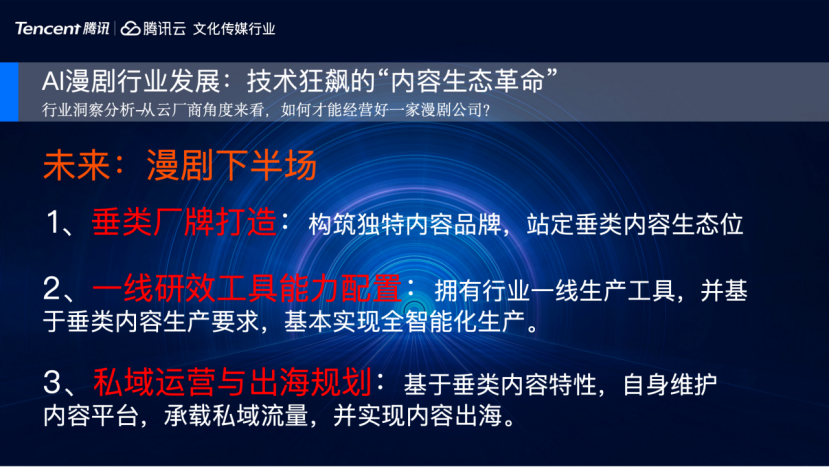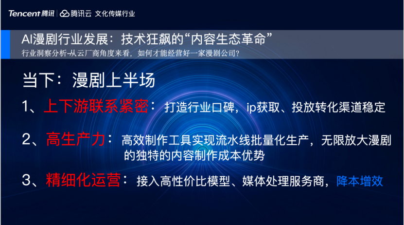 第二点是高生产力,需要配置我们的高效制作工具,实现漫剧内容流水化、批量化生产,来无限放大行业独特的内容制作成本优势;