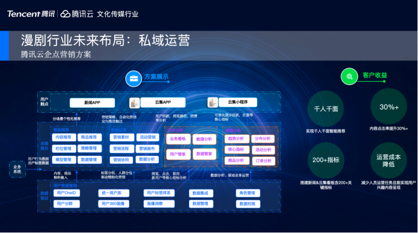 私域运营方面,腾讯云提供完整的企点营销方案。目前许多零售、传媒、泛互客户都在使用我们这套企点营销方案,包括企业微信、微信朋友圈互动和品牌宣发,都是基于这一套产品,它不仅提供客户自研APP内的用户数据交互与分析,以私域流量为核心的微信生态都能带来强有力的支持。