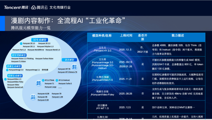 接下来给大家介绍腾讯的混元自研模型,全模态自研。在B端产业部署方面,是极具性价比非常高的系列模型。我们HY2.012月份发布时,也紧跟行业第一梯队。而下一代文生文模型,现在给大家做一个预告,腾讯HY3.0也即将在4月份发布,正在进行最终的内部业务测试。