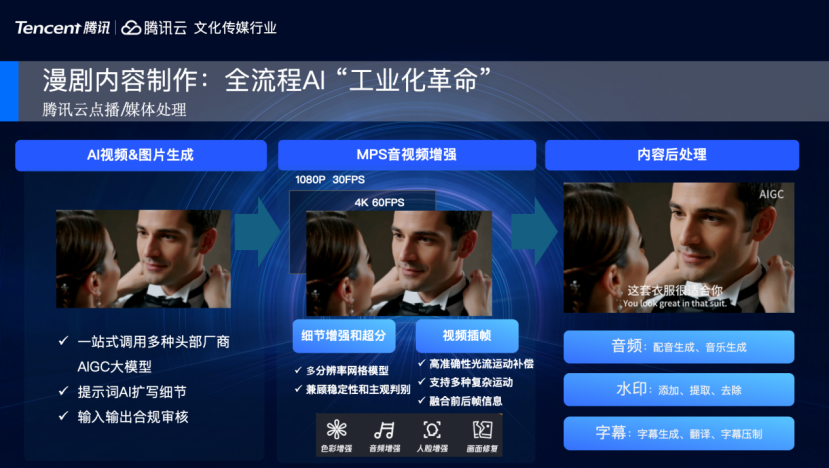 其次是全链路流程化作业,尽可能少人工干预的全智能化生产是持续追逐的目标,对此,腾讯提供多款AI短漫剧工作流服务产品,待会也会一一详尽地介绍。