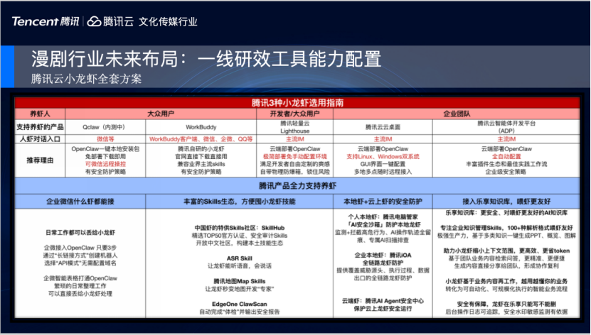 首先是最近爆火的小龙虾;我们不仅为大众用户提供了QClaw,还有WorkBuddy;对于个人开发者也提供了腾讯轻量云服务器,对于企业团队,我们重点推出腾讯云桌面、腾讯云智能体开发平台与ClawPro。