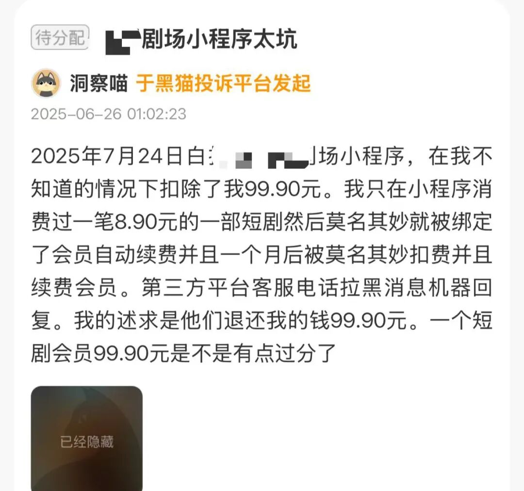 「2025年7月24日,xx剧场小程序,在我不知道的情况下扣除了我99.9元。我只是在小程序消费过一笔8.9元的一部短剧,然后莫名其妙被绑定了会员自动续费,并且一个月后被莫名其妙扣费,并非续费会员。第三方平台客服电话拉黑消息机器回复。我的诉求是他们退还我的钱99.9元,一个短剧会员99.9元是不是有点过分了。」